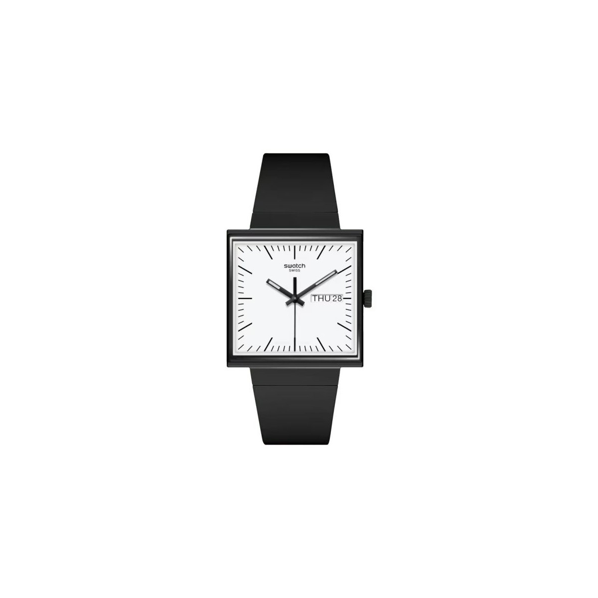 Bioceramic watch, What if black line, quartz time only. Black silicone strap and 33.25 mm square case in edge-to-edge biosurced glass and black dials. Buckle closure.