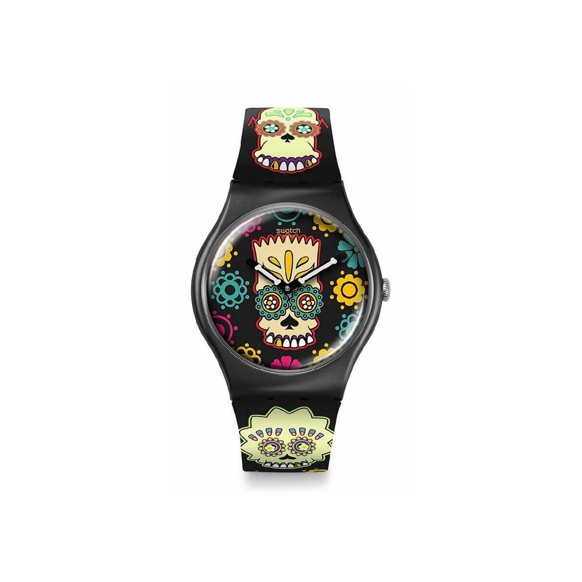 Swatch New Gent Halloween Watch from The Simpsons Collection, this fun special watch for the scariest holiday of the year designed to celebrate Dia De Los Muertos