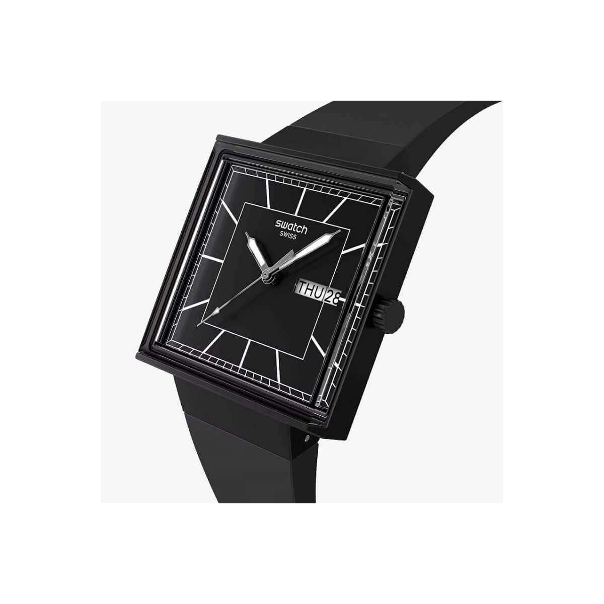 The What if black watch with square bioceramic case features an edge-to-edge biosurfaced glass that allows a lateral view of the watch hands. The square dial features glow-in-the-dark hands and a date window at 3 o'clock.