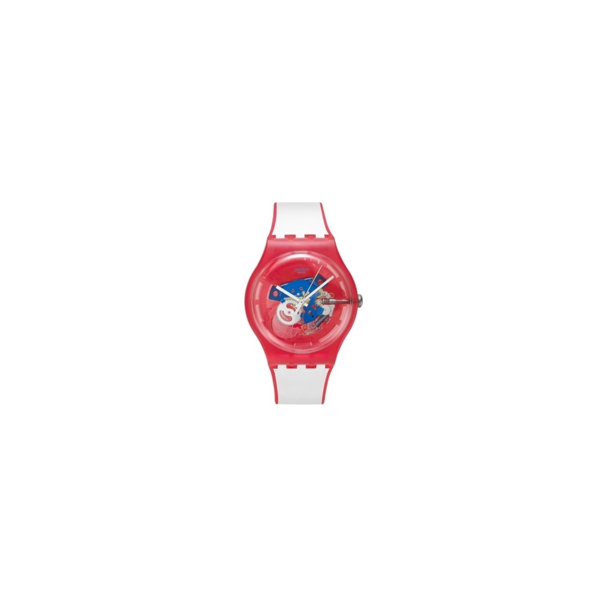 Silicone bracelet watch with transparent dial with gears, red case and bezel, white strap