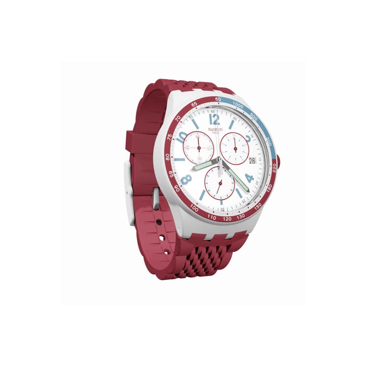 White dial with multicolor and date indexes at 3 o'clock, housed in a light gray satin plastic case with coordinated bezel. The textured red strap is made of red silicone and has a coordinated passageway and a light gray satin plastic buckle.