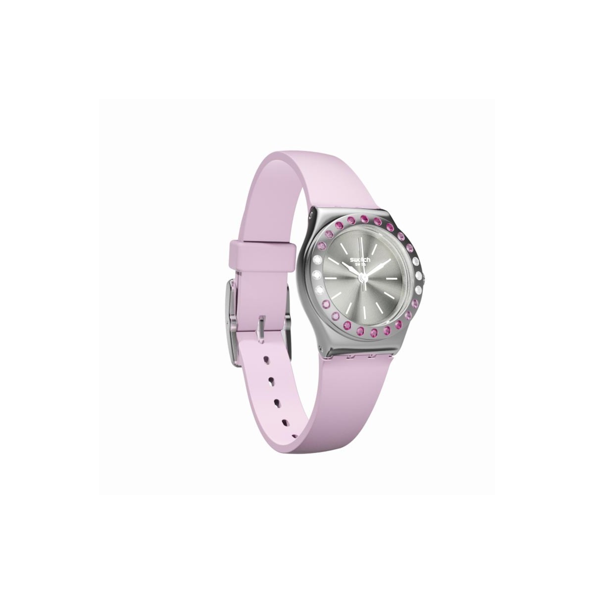 Silver brushed dial with white indexes and bezel in polished stainless steel decorated with multicolored crystals. The polished stainless steel case is mounted on a pink opaque silicone strap with coordinated passageway and glossy stainless steel buckle.
