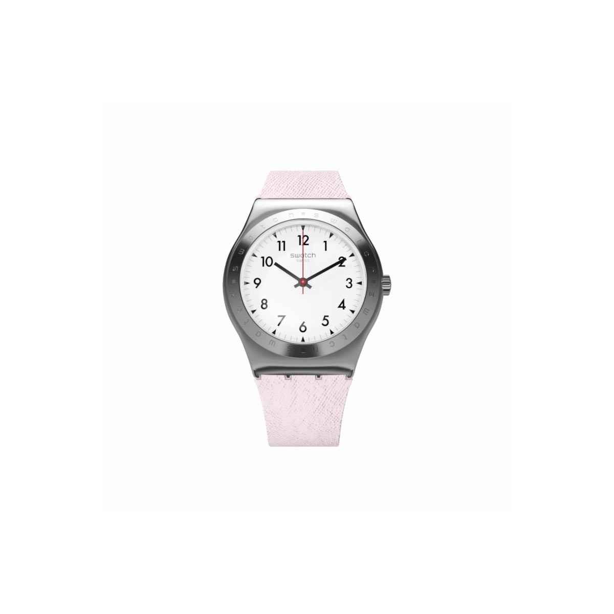 White dial with black indexes surmounted by a polished stainless steel bezel with notches. The glossy stainless steel case is mounted on a light pink textured strap with pink rubber passageway and glossy stainless steel buckle.