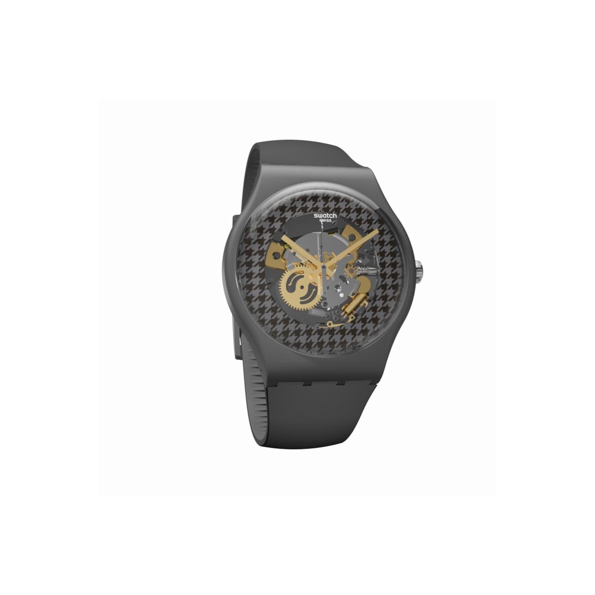 A watch with a back cover and multicolored mechanism on the back of a black and gray dial, housed in a satin gray plastic case. The matte gray silicone strap has a passageway in the same material and gray satin plastic buckle for a monochrome look.