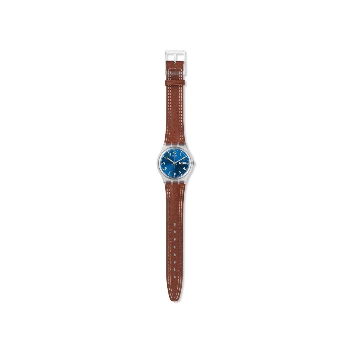 Gent WINDY DUNE 34 mm Time to Swatch collection with blue dial and white hour markers, plastic case and brown stitched leather strap; quartz movement