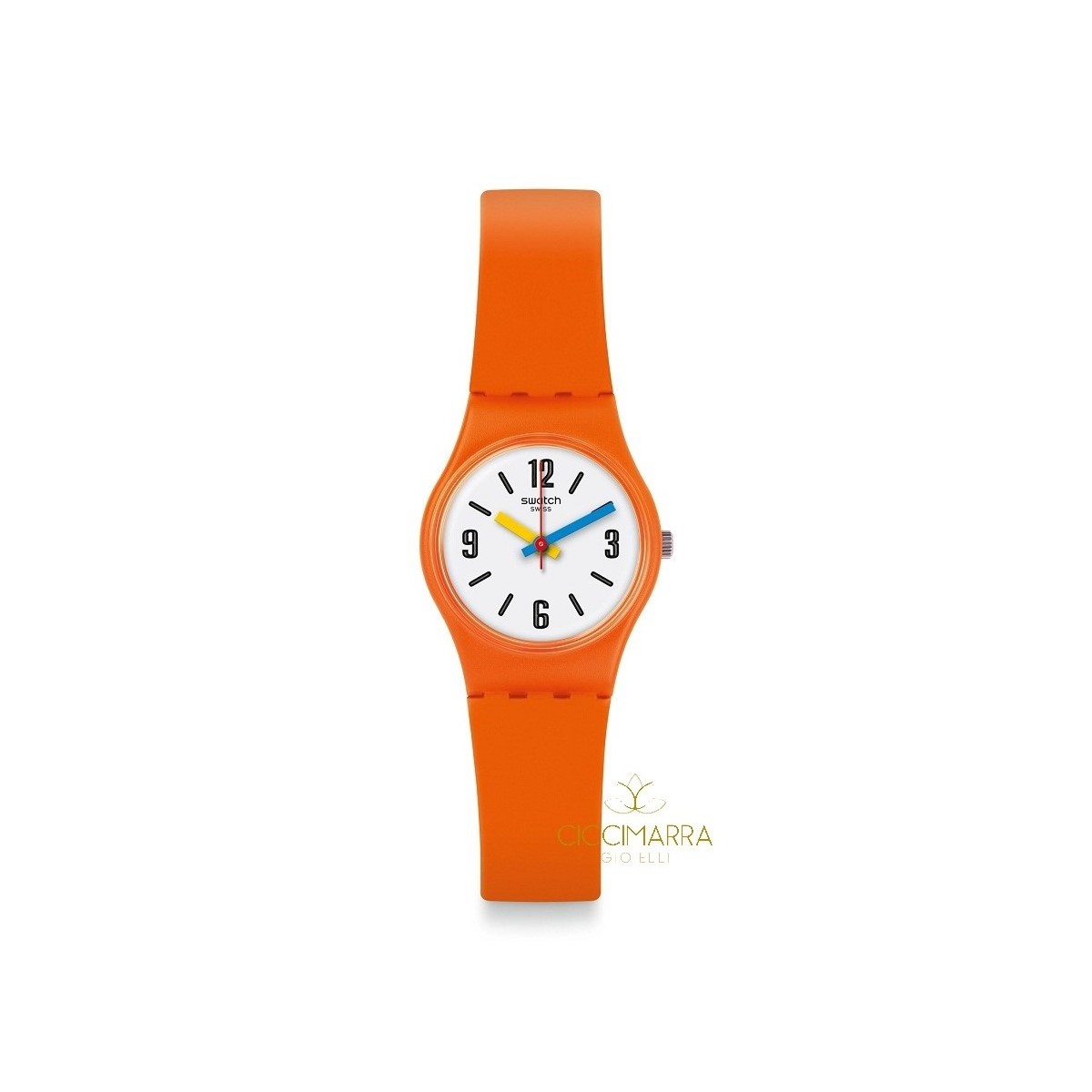 Woman watch from the mischievous style of the Originals Lady Bau Swatch collection with silicone strap and orange plastic case, white dial with black 3D print numbers and yellow and light blue hands and quartz movement.