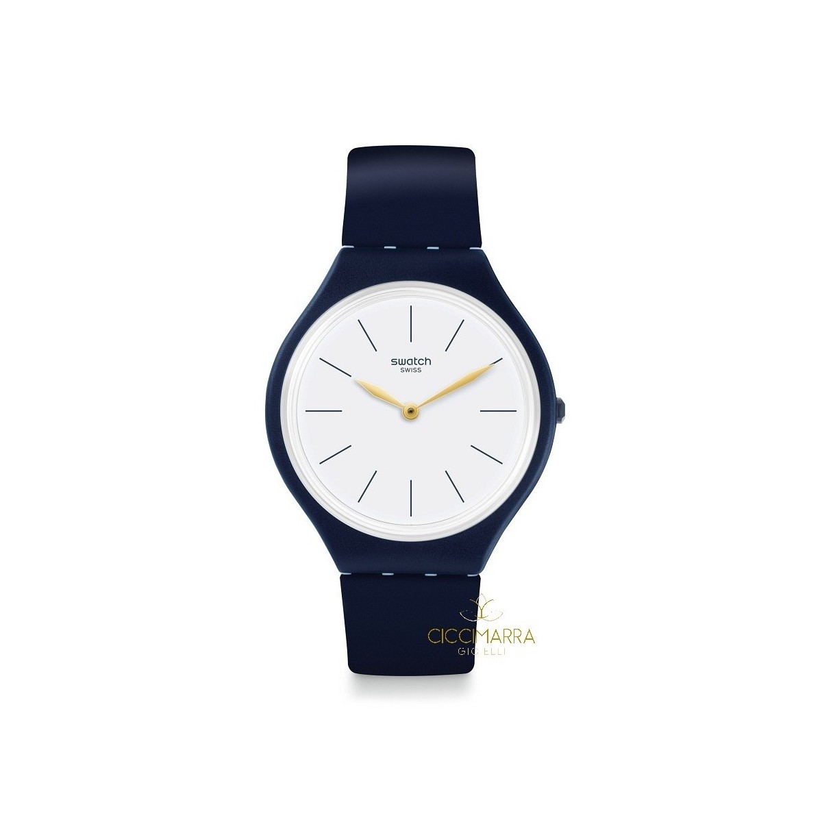 Ultra-thin unisex watch from the Core Refresch collection with a blue silicone strap and a blue plastic case with a visible white part on the back, white dial with black indexes and gold hands, quartz movement.