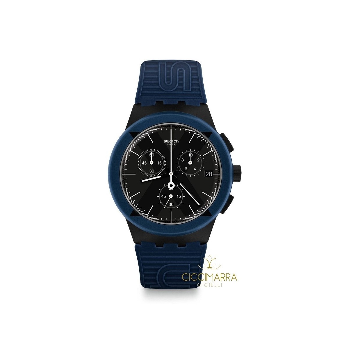 Bau Swatch Crono Plastic collection man watch with silicone strap and navy blue plastic case, gray dial, quartz movement with chronograph