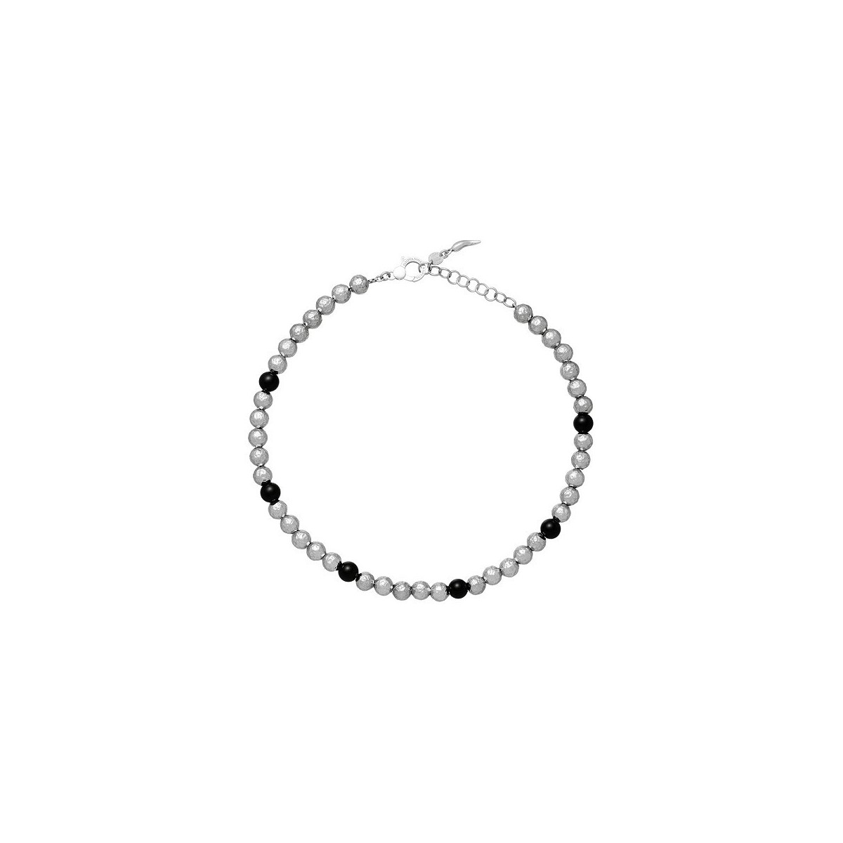 Necklace, from the Optical collection, in 925 silver. Inspired by 60s fashion, it is made of hammered silver spheres alternating with shiny black onyx spheres, between black and white, light and shadow. Lobster clasp with adjuster links.