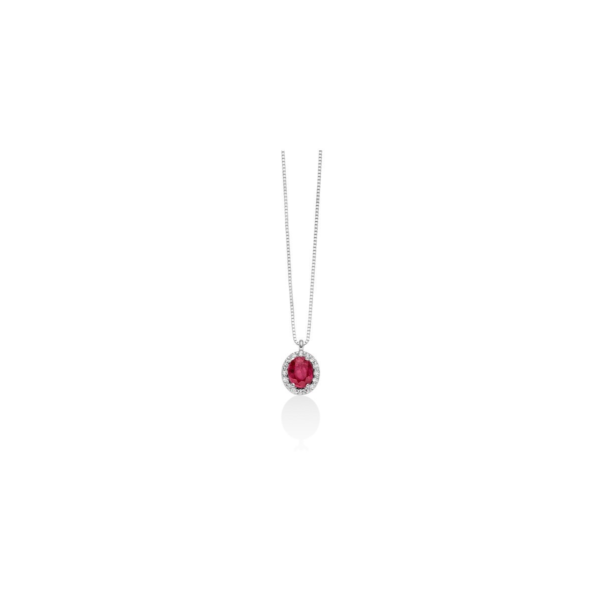 Miluna women's necklace, from the Le Gemme collection, made in 18-karat white gold with a 0.35-carat oval-shaped natural ruby pendant surrounded by sixteen small natural brilliant-cut diamonds of 0.64 carats.