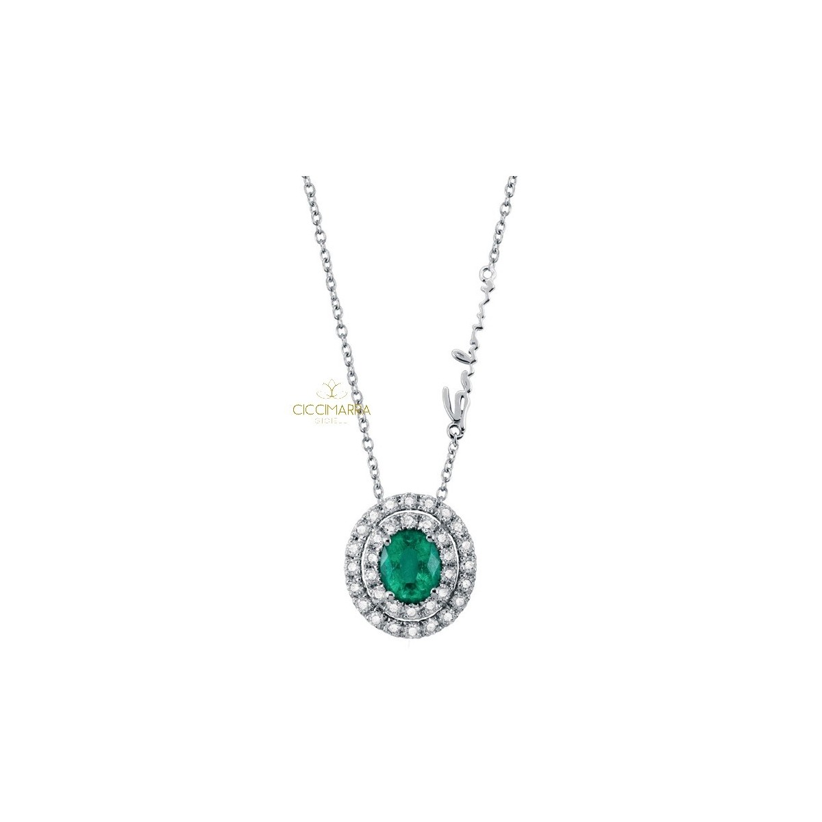 Salvini logo necklace in 750/1000 white gold with pendant made of natural double-cut brilliant diamonds and centrally an oval-cut natural green emerald. Emerald Green, a unique and inimitable color, it is immediately recognizable and gives the diamond jewelry that touch of originality and freshness typical of the emerald green color.