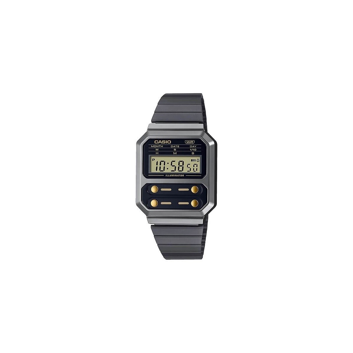 Casio unisex watch, from the Vintage collection, quartz movement, with stainless steel bracelet with IP finish with adjustable closure, black resin case of 32.7 mm in diameter, with digital display with golden buttons, dial illuminated by a diode for light emission and impact-resistant acrylic glass. It is equipped with a daily alarm that remembers the events that are repeated daily, by emitting a set acoustic signal. This model is waterproof to DIN 8310 and / or ISO 22810, therefore withstands light splashes. In addition, the battery has a life of about three years.
