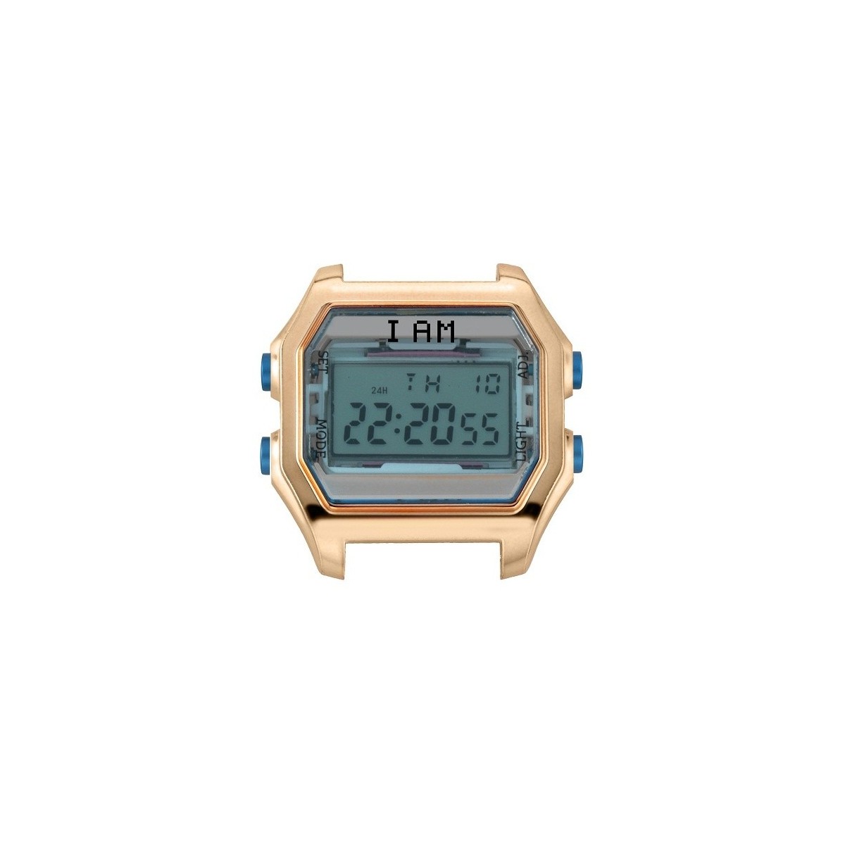 I AM watch case in rosé metal effect polycarbonate with four blue buttons, blue dial and quartz digital movement - IAMTHEWATCH