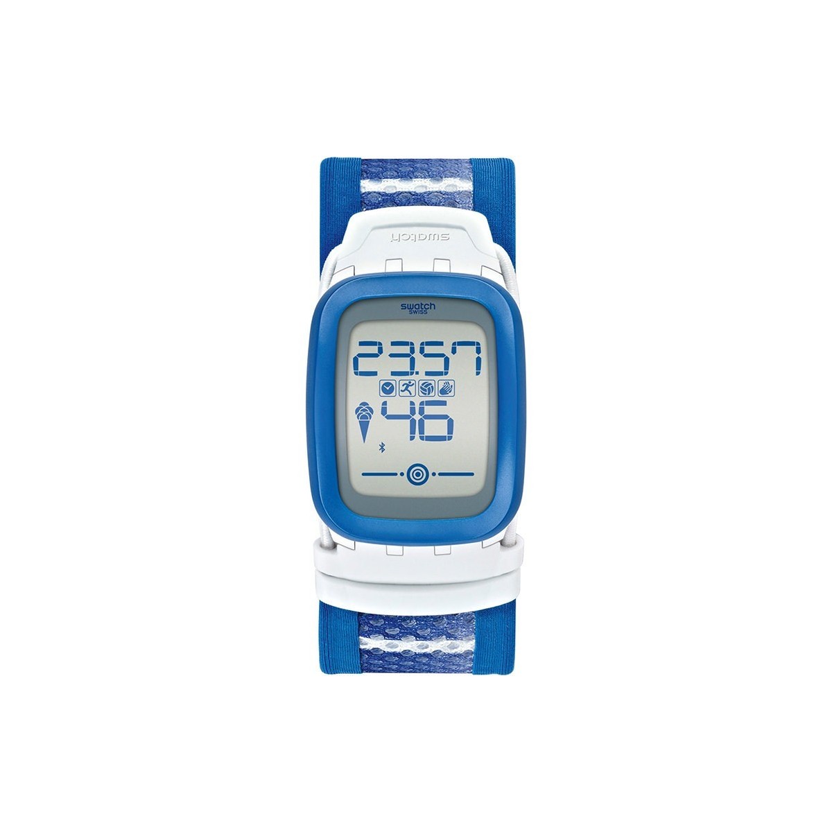 Aims high with clock SKYZERO (SUVW102), with innovative features for sport and beach volleyball. The sturdy plastic case Blue opaque is mounted on a plastic strap in blue and white striped fabric. The touch screen display with a gray background and blue numbers allows you to access features pedometer, Power Hits, Power Claps and many other and connect the watch to your APP Touch Zero One of Swatch.