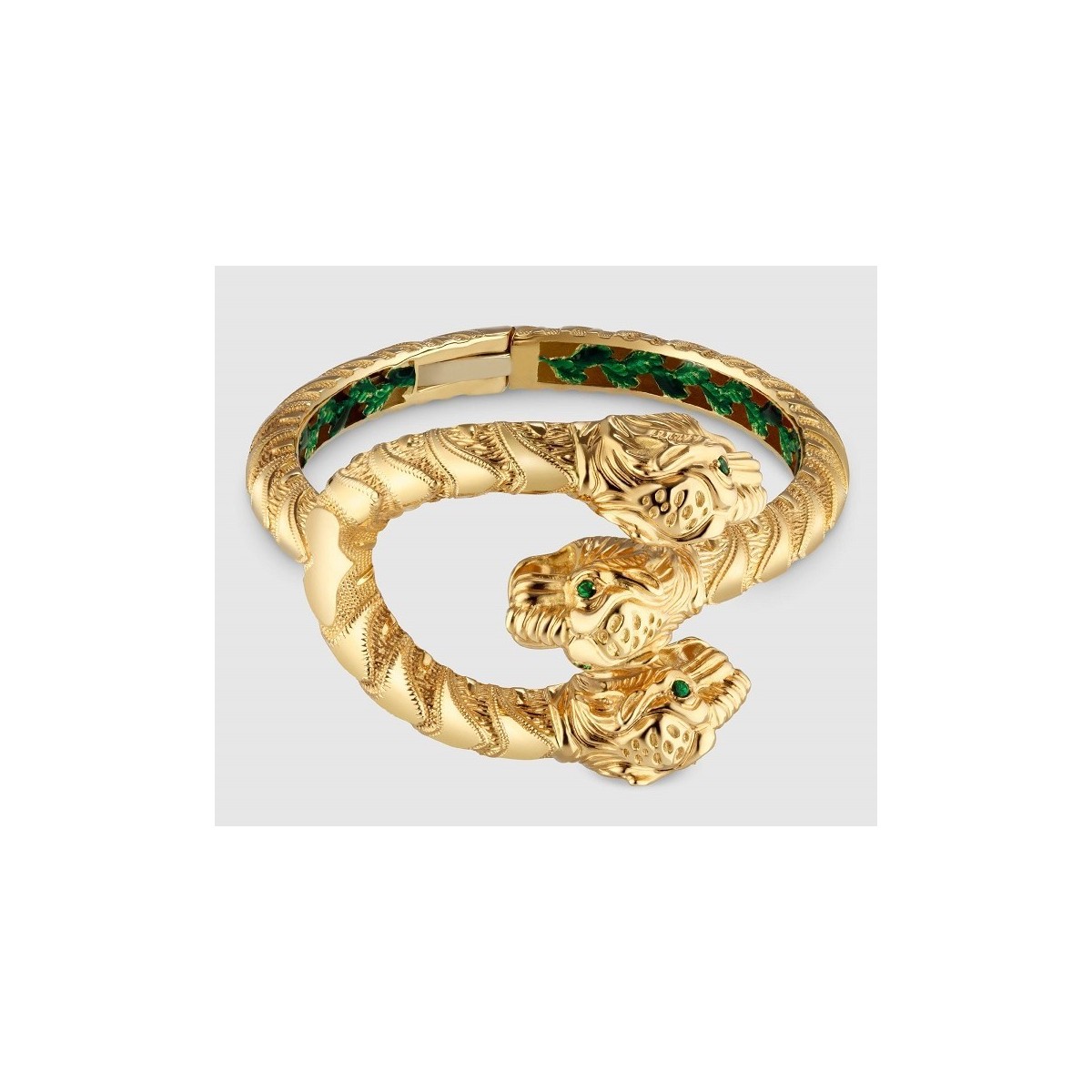 18kt yellow gold and green enamel Bangle with opening snap, Dionysus with three heads and green tsavorites model on the eye-measure 17 cm