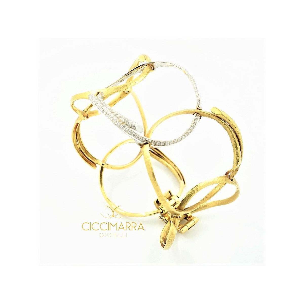 Semi-rigid bracelet in yellow gold and 18kt white gold hammered and satin with natural brilliant cut diamonds