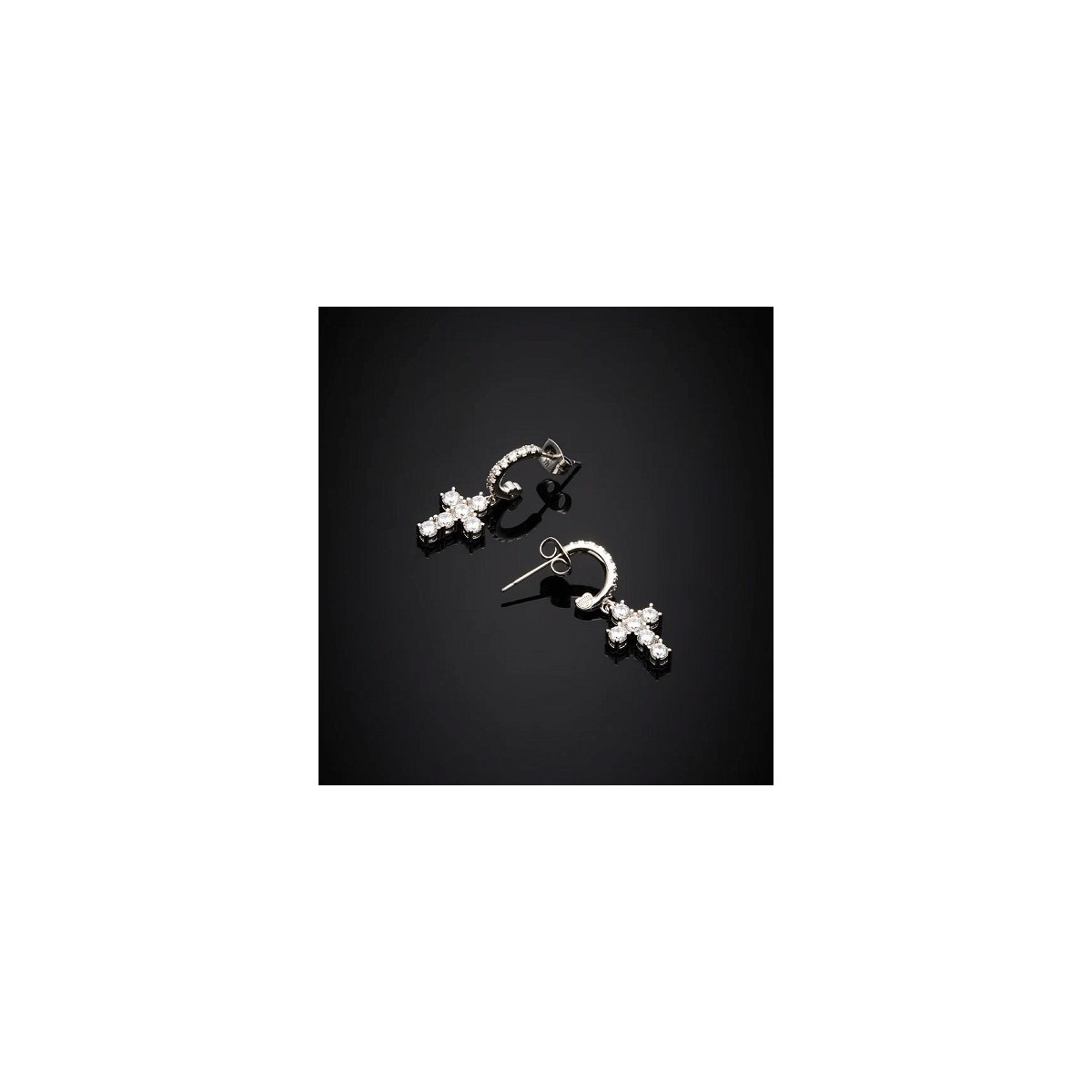 Hoop earrings with pavé and cross-shaped pendant embellished with white zircons. Signed by the well-known influencer Chiara Ferragni belonging to the Bold Cross collection. Made in silver plated metal. Butterfly closure.