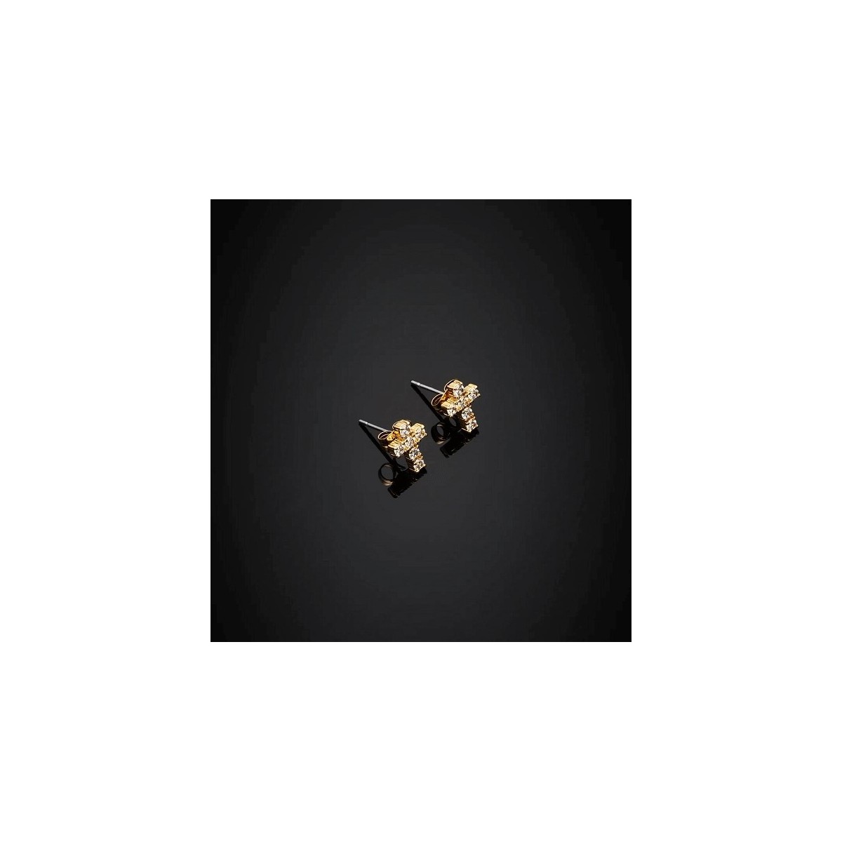 Cross-shaped stud earrings embellished with white zircons. Signed by the well-known influencer Chiara Ferragni belonging to the Bold Cross collection. Made of 18kt yellow gold plated metal. Butterfly closure.