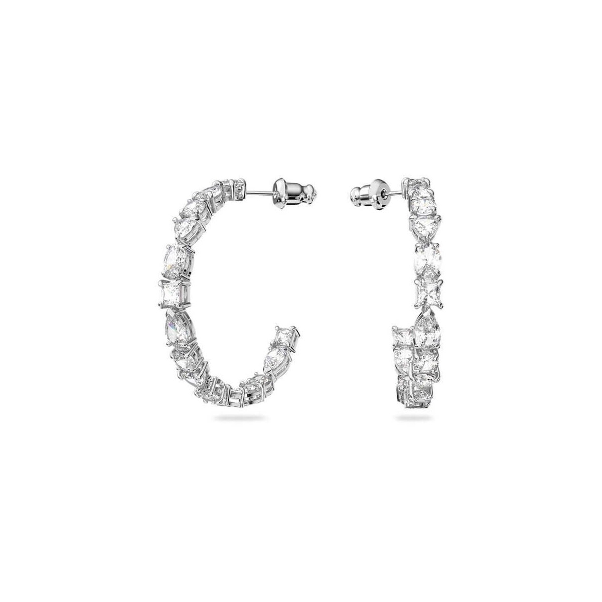 Swarovski hoop earrings, from the Tennis Deluxe collection, made with a row of white stones with a round, square, Trillian and teardrop cut, rich in facets.