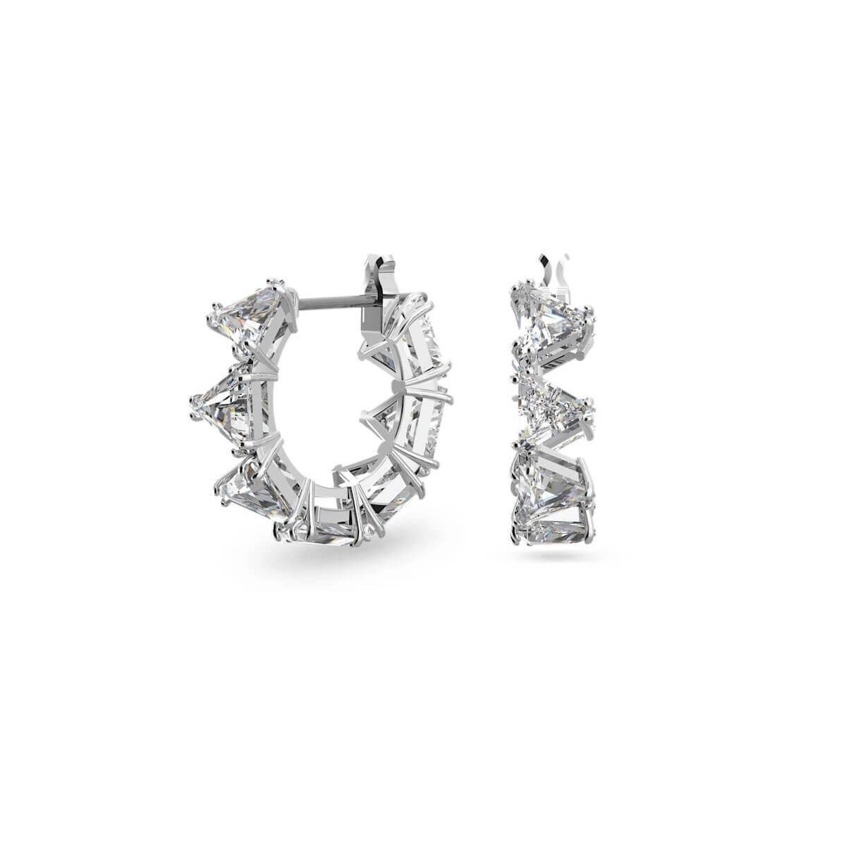 Small Swarovski hoop earrings, from the Millenia collection, made with a row of white tessellated triangle-cut stones, mounted on a rhodium-plated setting. The zircons are rich in facets that give luster to the wearer's face.
