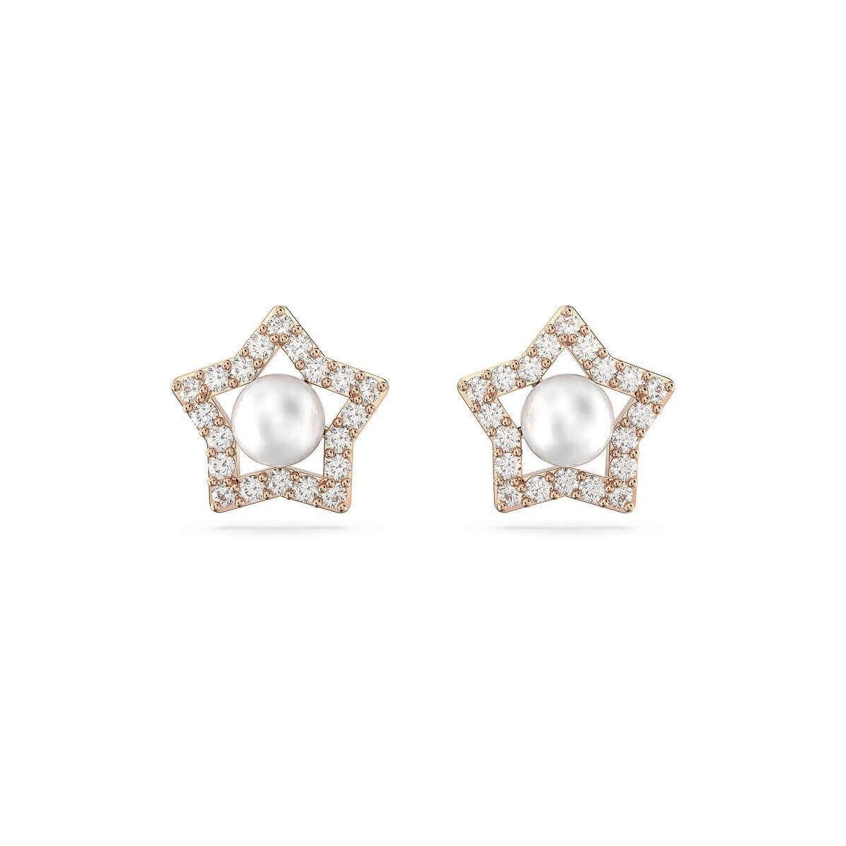 Swaroski women's lobe earrings belonging to the Stella collection. Made from central crystal pearl embellished with brilliant cut zircon pave star motif mounted in claws on elegant rose gold plating