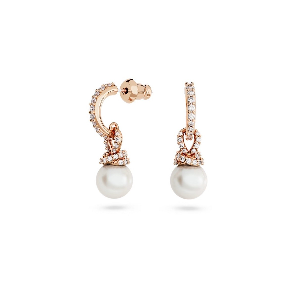 Drop earrings, with rose gold-tone plated hoops and intertwining sparkling pavé crystals holding a luminous Swarovski Crystal Pearl. Butterfly closure..