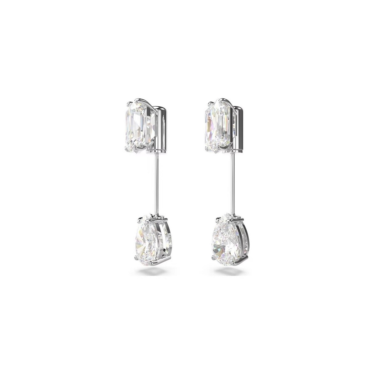 Swarovski women's earrings, from the Mesmera collection, features a rhodium-plated bar with rectangular and drop-shaped Swarovski Zirconia prong-set at each end, the stones are made in distinctive cuts.