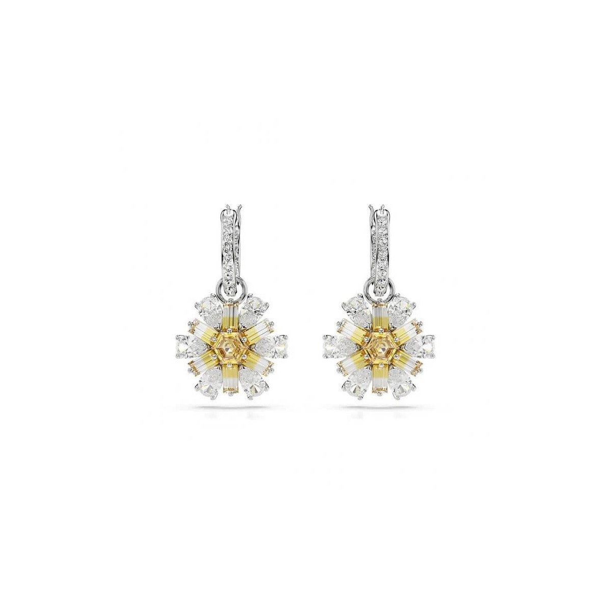 The new Swarovski collection, Idyllia, is inspired by spring, offering these very elegant hoop earrings with a central yellow Swarovski Zirconia pendant framed by small rays with a shaded effect of white crystal on a rhodium-plated frame.