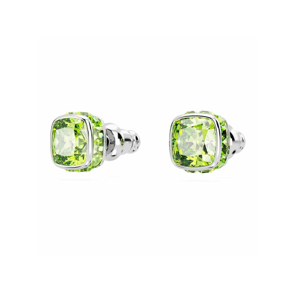 Swarovski women's lobe earrings, from the Birthstone collection, rhodium plated, feature a single Square cut stone in a green tone. Butterfly closure. Birthstone for the month of August.
