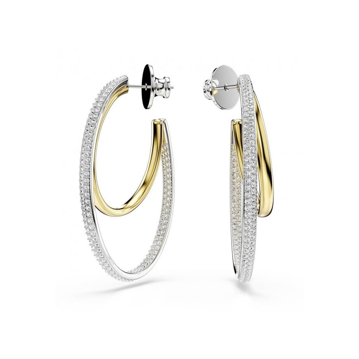 Pierced earrings, open circle model, medium, Round cut, from the Hyperbola collection, for women by Swarovski, made with a double circle setting: the smaller one is plated in yellow gold inside a larger rhodium-plated circle and embellished with transparent Swarovski zirconia.