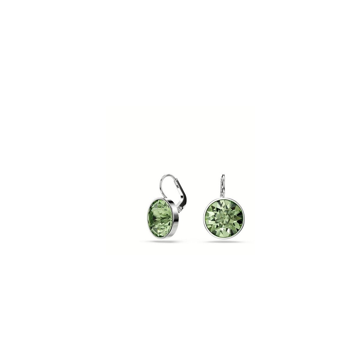 Pendant earrings, from the Bella collection, for women Swarovski, enhance the interaction between geometry and light. The earrings are made with rhodium plating, the pendant features a central green crystal.