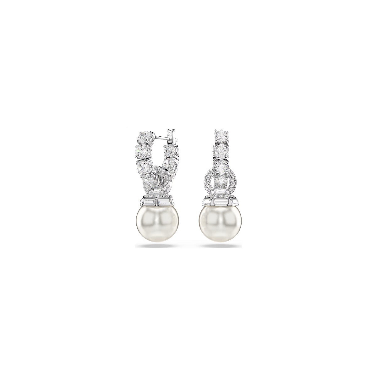 Swarovski designer earrings from the Matrix collection. The earrings are made with rhodium plating. They feature tennis hoops and connecting rings embellished with bright pavé, while the pendant features Swarovski Crystal Pearls.
