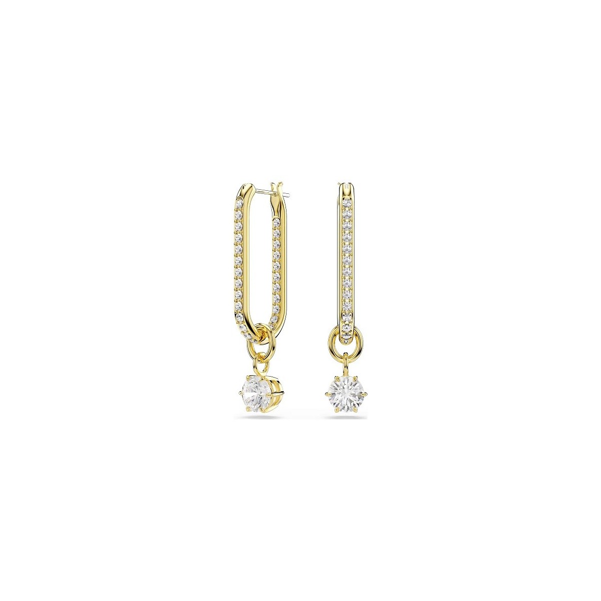 Swarovski women's drop earrings from the Constella collection made with gold-colored plating, Swarovski Zirconia, set in prongs that delicately dangle beneath an elongated hoop.