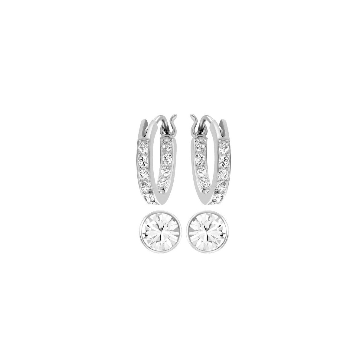 This unique rhodium-plated set includes two pairs of pierced earrings. The mini hoops are delicately embellished with clear crystal pavé and can be worn alone or dangling from the clear crystal studs. Mix and match to fit your mood and inject some sparkle into your everyday look!