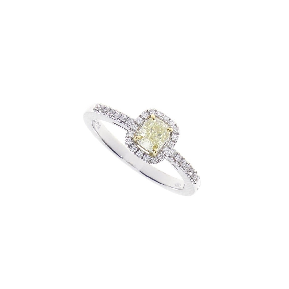 18 kt white gold ring from the Timeless Fancy line with 0.45 carat cushion-cut yellow diamond surrounded by 0.16 carat diamond pave