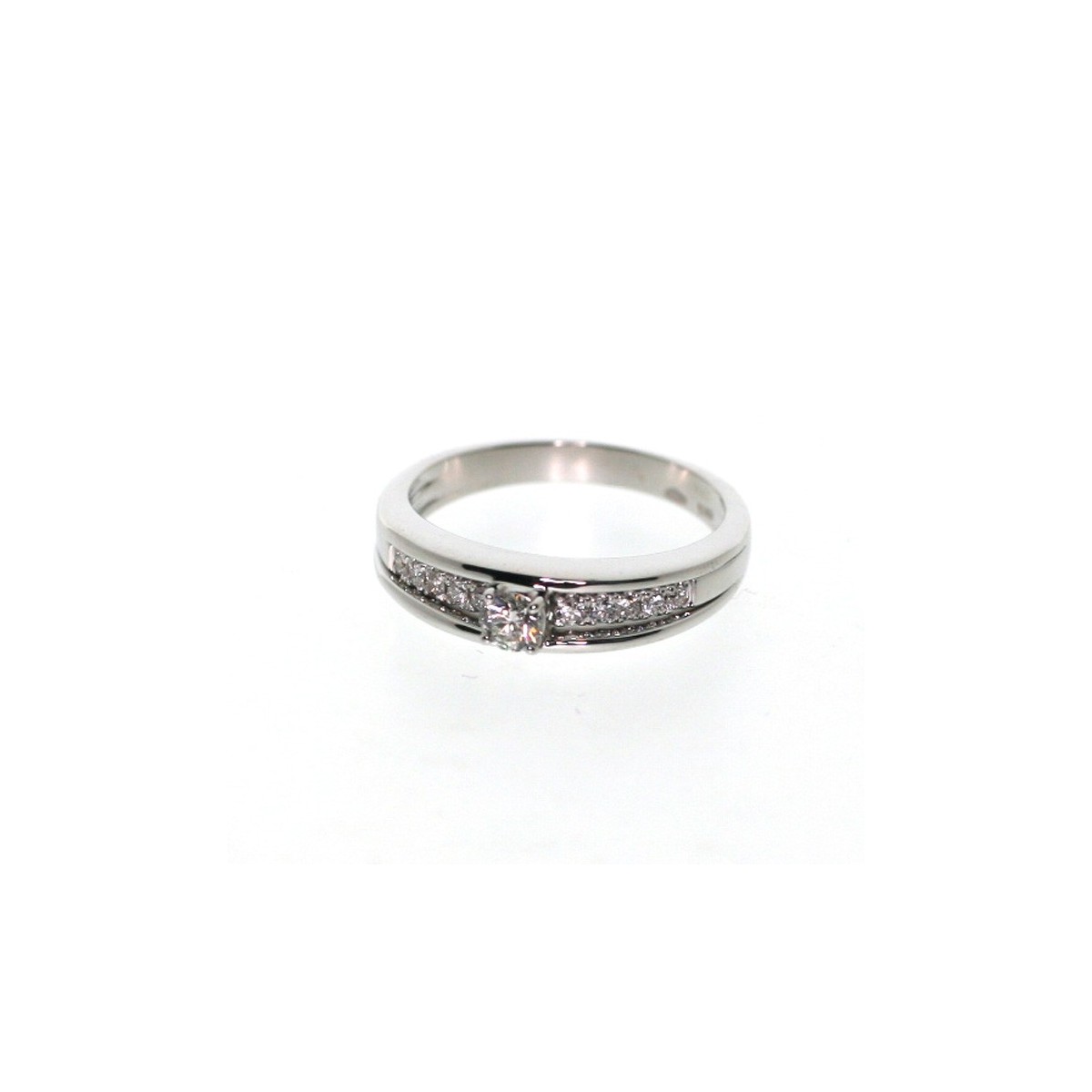 Ring in 750/1000 white gold composed of a radiant cut natural diamond with high setting and five diamonds on the right and on the left on the base.