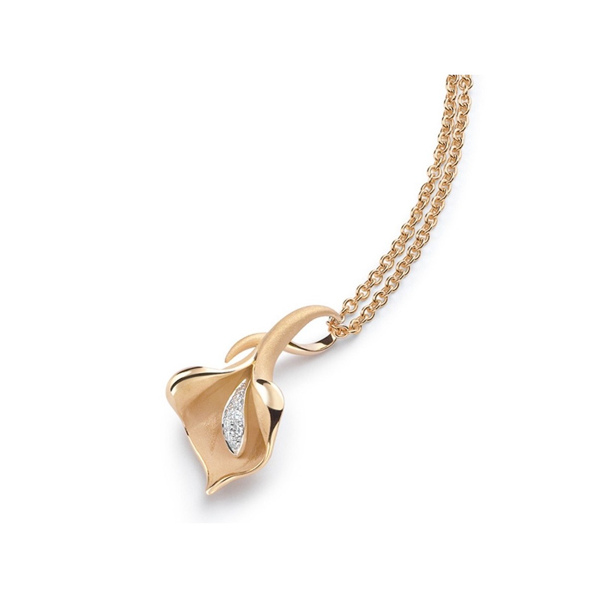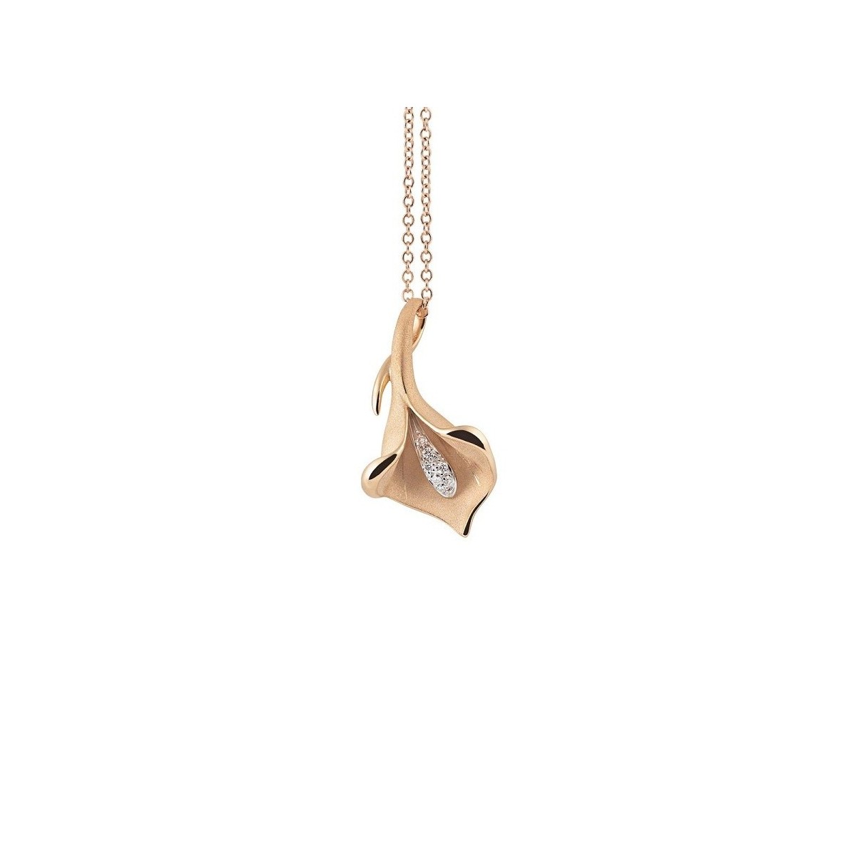 Calla Lily collection flower pendant necklace in gold polished and satin apricot Orange 750 ‰ and brilliant cut natural diamonds.