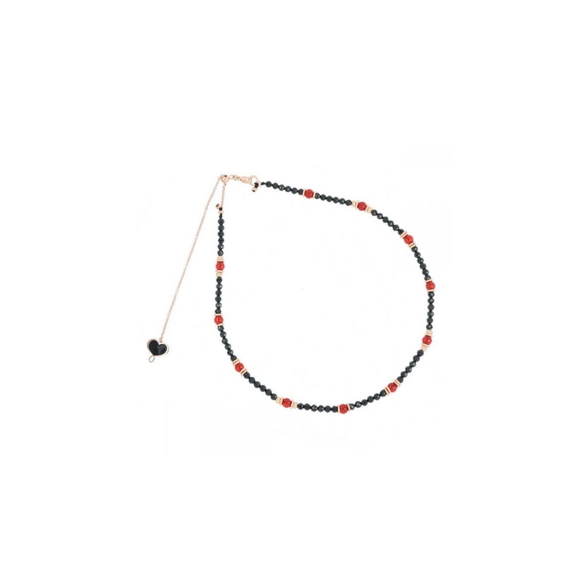 Maman Et Sophie women's girogola necklace, from the Spinello & Corniola collection, made of 925 silver with pink gold electroplating and small spinel and carnelian spheres interspersed with small pink spheres. Lobster clasp closure with black enameled Maman heart. The length of the necklace is adjustable thanks to the sliding ball.