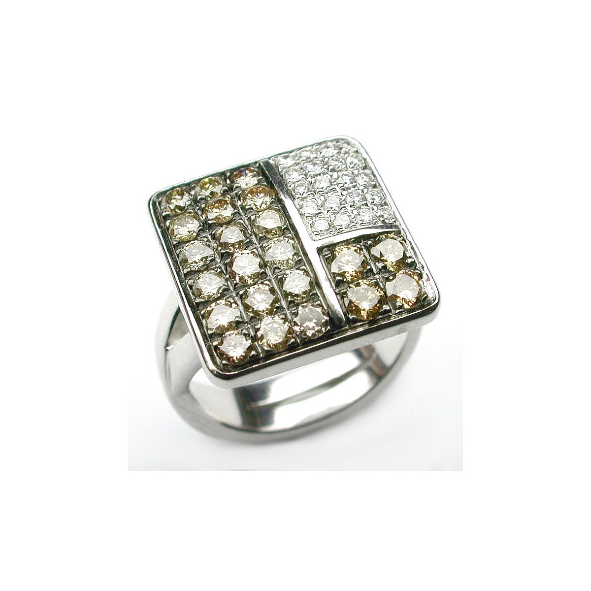 750/1000 white gold ring composed of a double band and a base on which are mounted brilliant brown cut diamonds and smaller white diamonds.