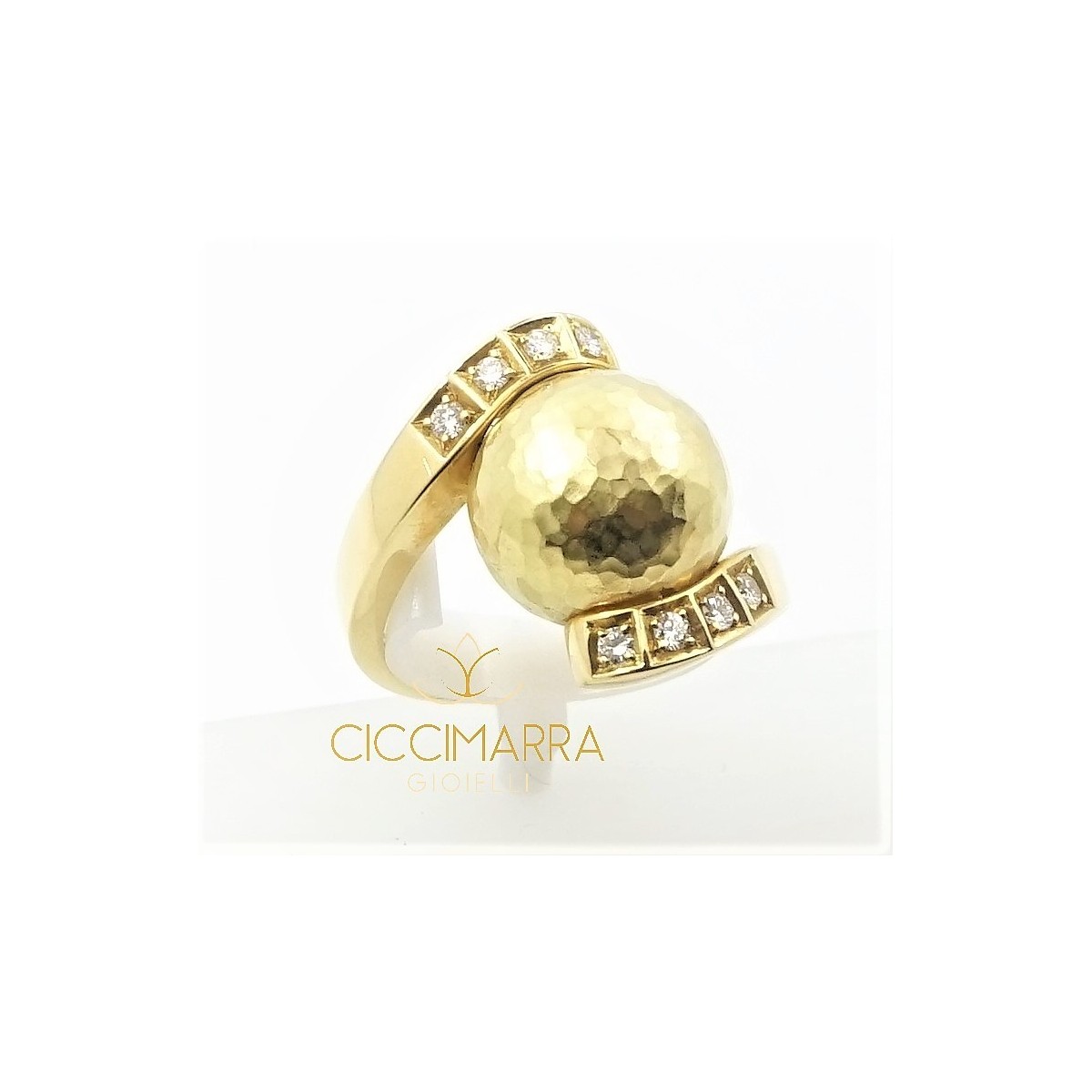 Ring with large central sphere in hammered and polished 18kt yellow gold with natural brilliant cut diamonds mounted on the stem