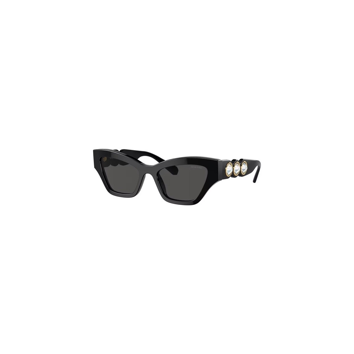 Swarovski sunglasses inspired by the Imber family. The design features a black acetate frame and black lenses, along with three large Cry crystals set in a bezel setting.