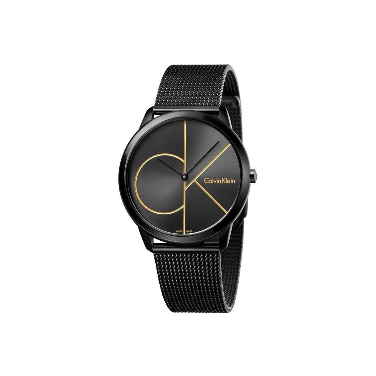 Minimal line man wrist watch with milano knit strap in black steel, black dial with logo and golden hands