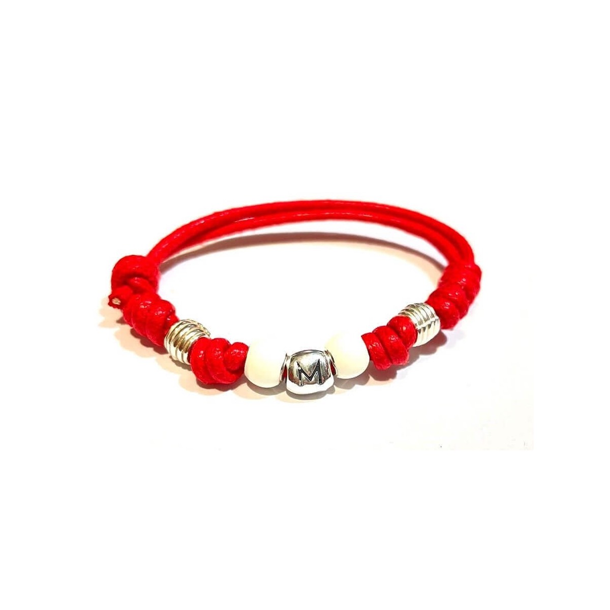 Red cord bracelet with buttercream beads, snowball and letter M.