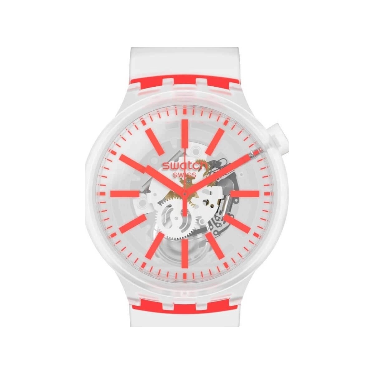 Watch man woman of the Summer Swatch Big Bold collection with transparent satin silicone strap and case of the same color with fluorescent orange hands and indexes, transparent dial with visible quartz movement.