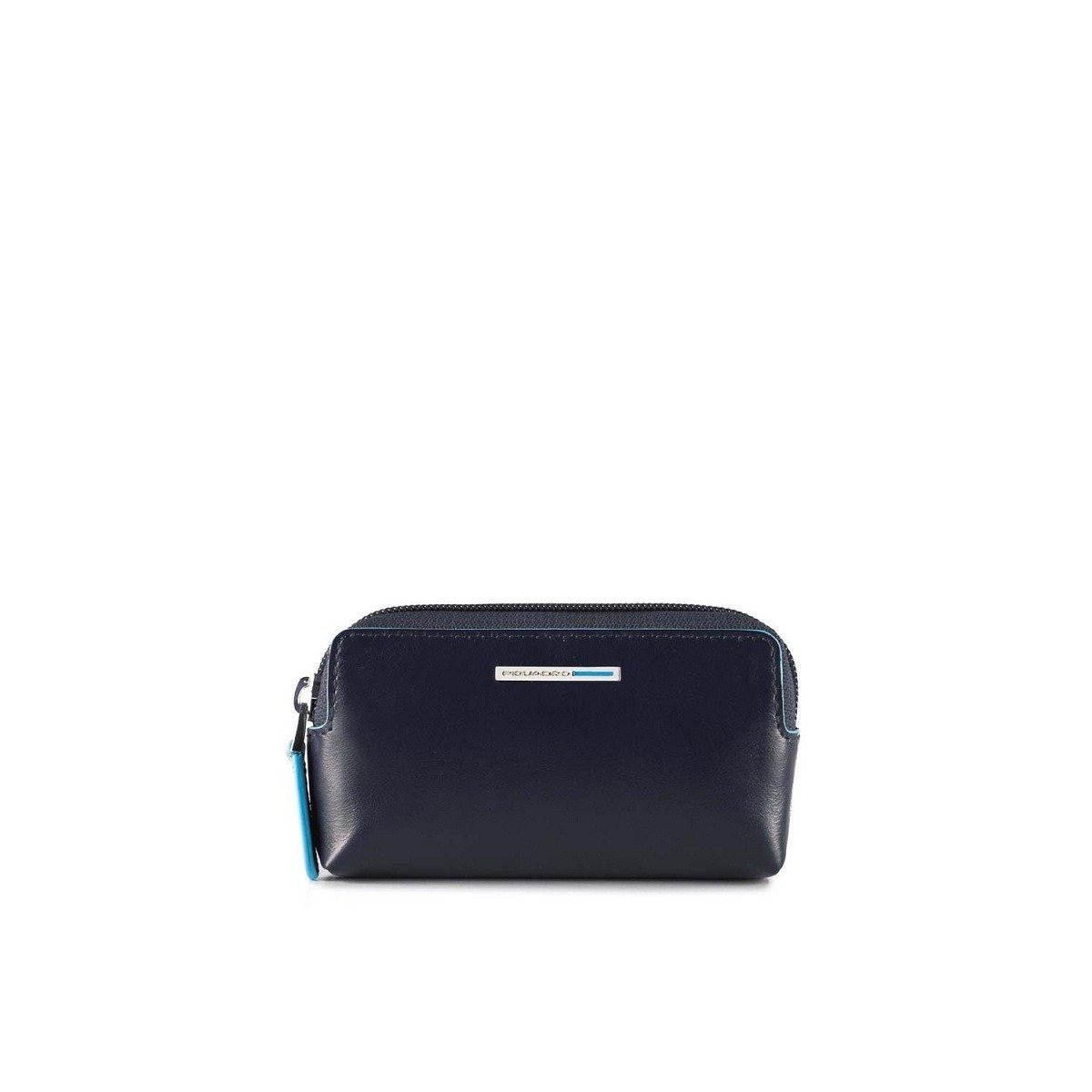 Zipper Closed Leather Keychain with Two Color Blue Blue Rings and Applied Logo