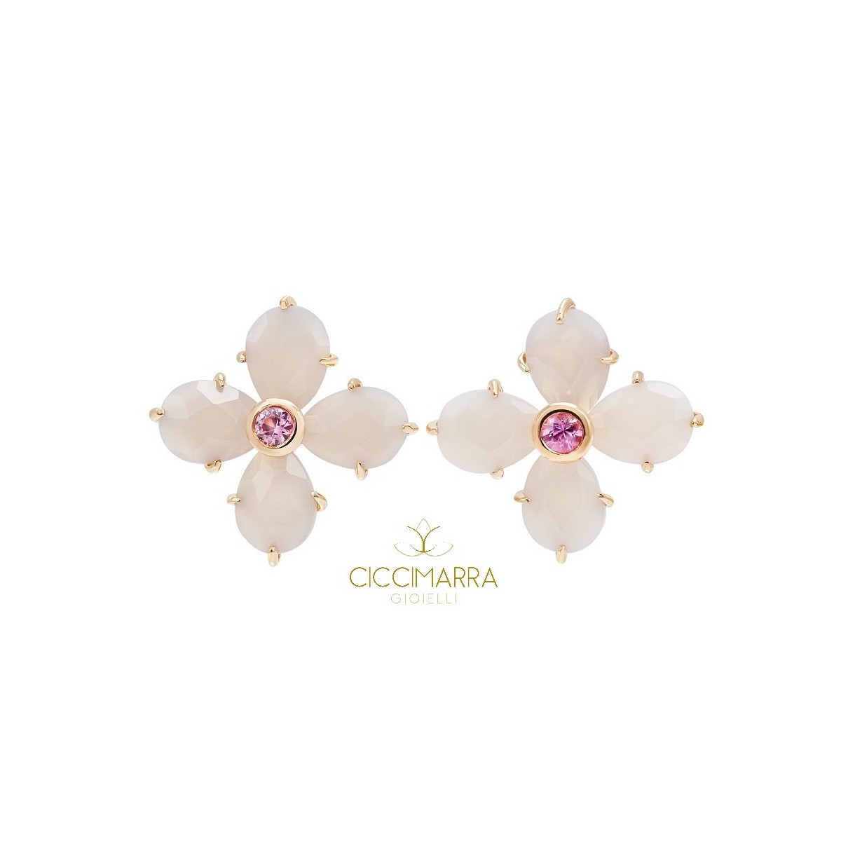 Earrings, Bloom line, flower shape in 18kt rose gold with faceted gray agate petals in central pink sapphire - code OXM111R8A9Z2