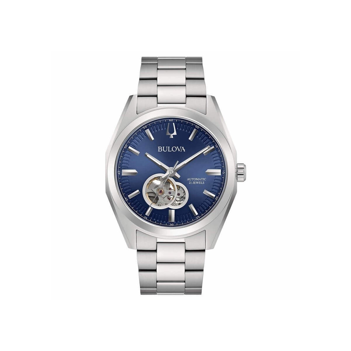 Bulova men's watch from the Surveyor line with a classic and timeless style, ideal for instilling character in your look. The watch has a time-only function with an automatic movement, 21 jewels. Crafted in stainless steel with a brushed and polished tooled steel link bracelet with a fold over clasp. The case has a diameter of 42 mm with a blue open heart dial. The screw-down caseback has a transparent porthole with visible movement.