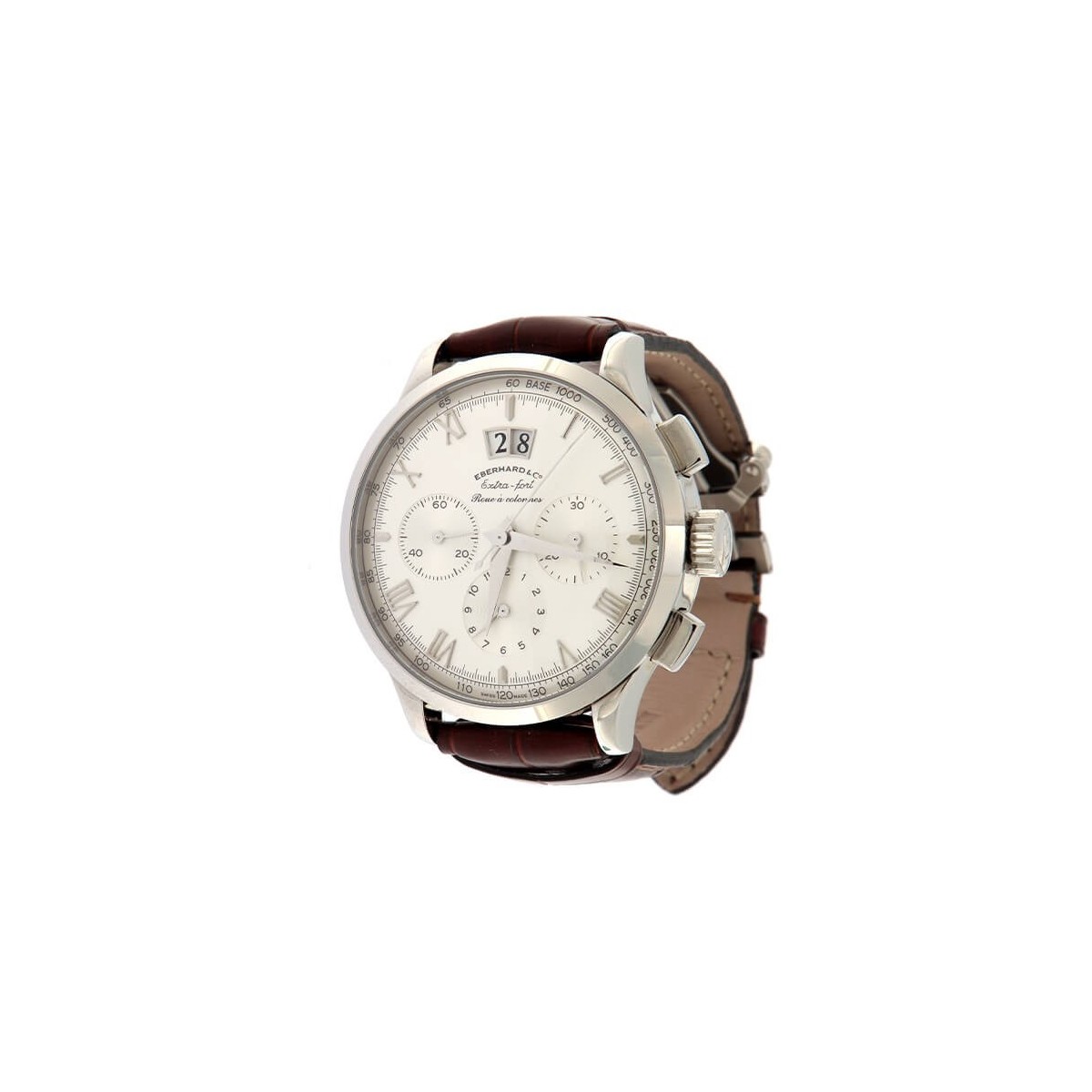 Eberhard Roue a Colonnes men's watch, from the Extra-Fort collection, with chronograph function and automatic movement with power reserve of up to 42 hours. Watch made with brown crocodile leather strap, 41 mm steel case with scratch-resistant and anti-reflective domed sapphire crystal, silver dial with steel indexes and hands and 3 circular chronograph counters (exclusive Eberhard patent). Pin clasp with Eberhard&Co logo and visible case back secured by 6 screws.