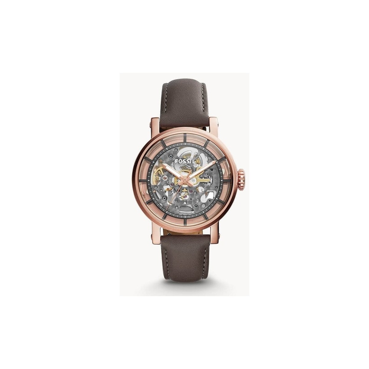 Automatic men's watch with gray leather strap with rose gold steel case and transparent dial with visible movement, gray indexes.