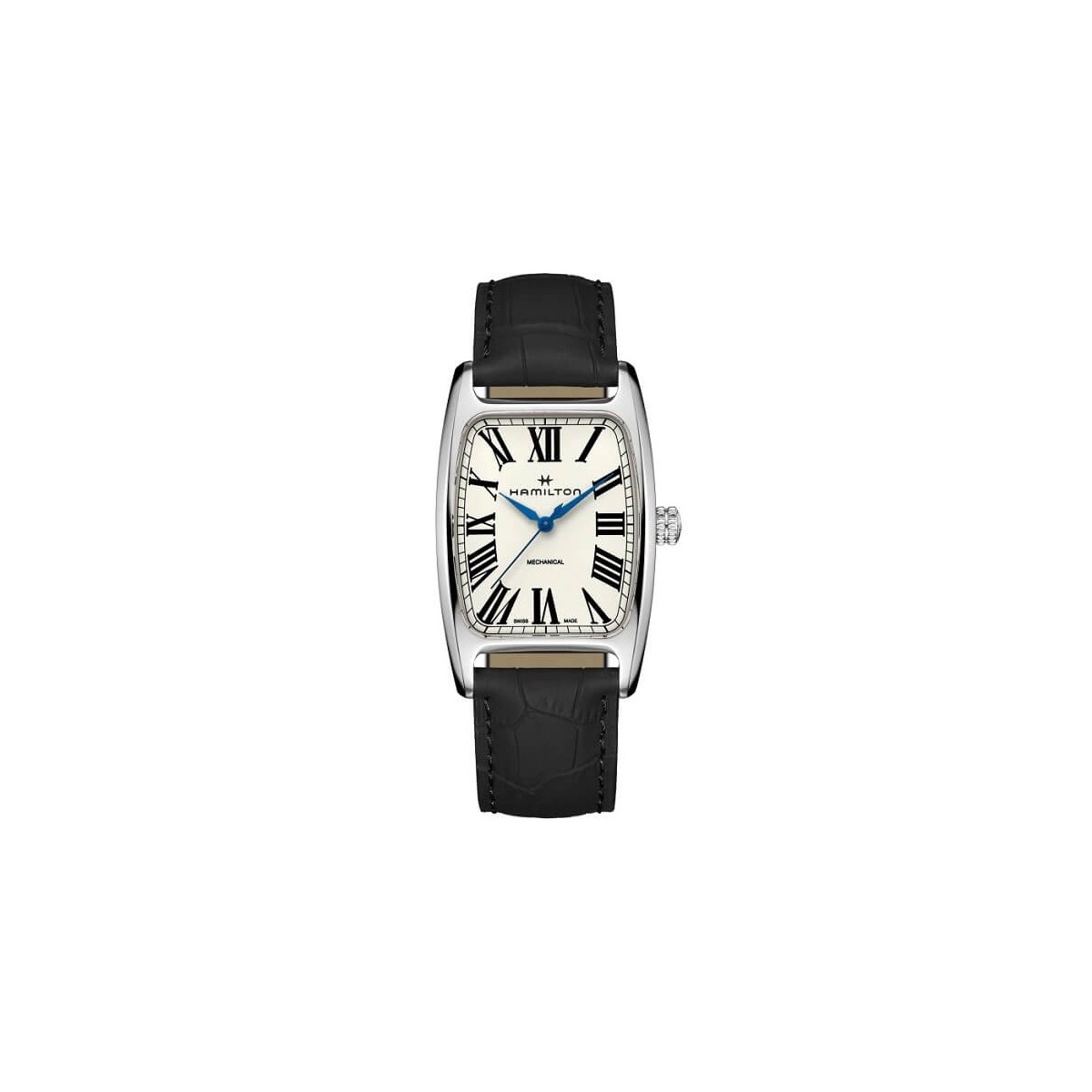 Hamilton Boulton Mechanical watch, from the American Classic collection, with mechanical movement with manual winding H-50 with power reserve of more than 80 hours, rectangular steel case measuring 34.5 x 38 mm with white dial and blue hands and indexes, with numbers black Romans and matte black crocodile print leather strap with pin buckle.